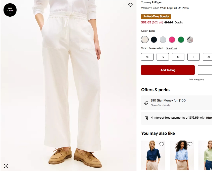 타미힐피거 우먼 린넨 와이드핏 풀온 팬츠 $62.65