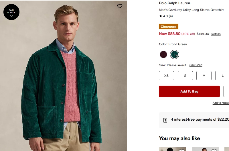 폴로랄프로렌 맨 코듀로이 유틸리티 오버셔츠 $88.80