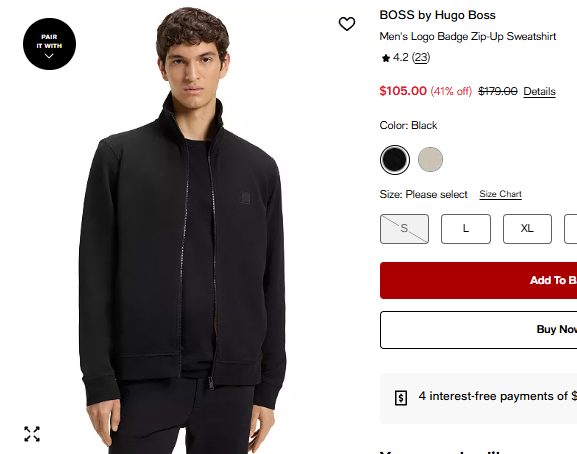 휴고보스 맨 로고 뱃지 집업 스웻셔츠 $105.00